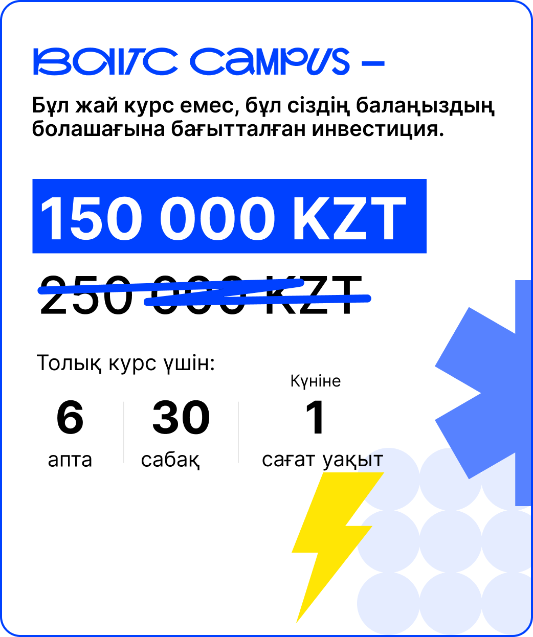 Бағдарлама сіздің балаңызға мектепте оқытылмайтын болашақ технологияларын зерттеуге және IT мен технологиялар саласында сұранысқа ие мамандықтарға дайындалуға мүмкіндік береді.